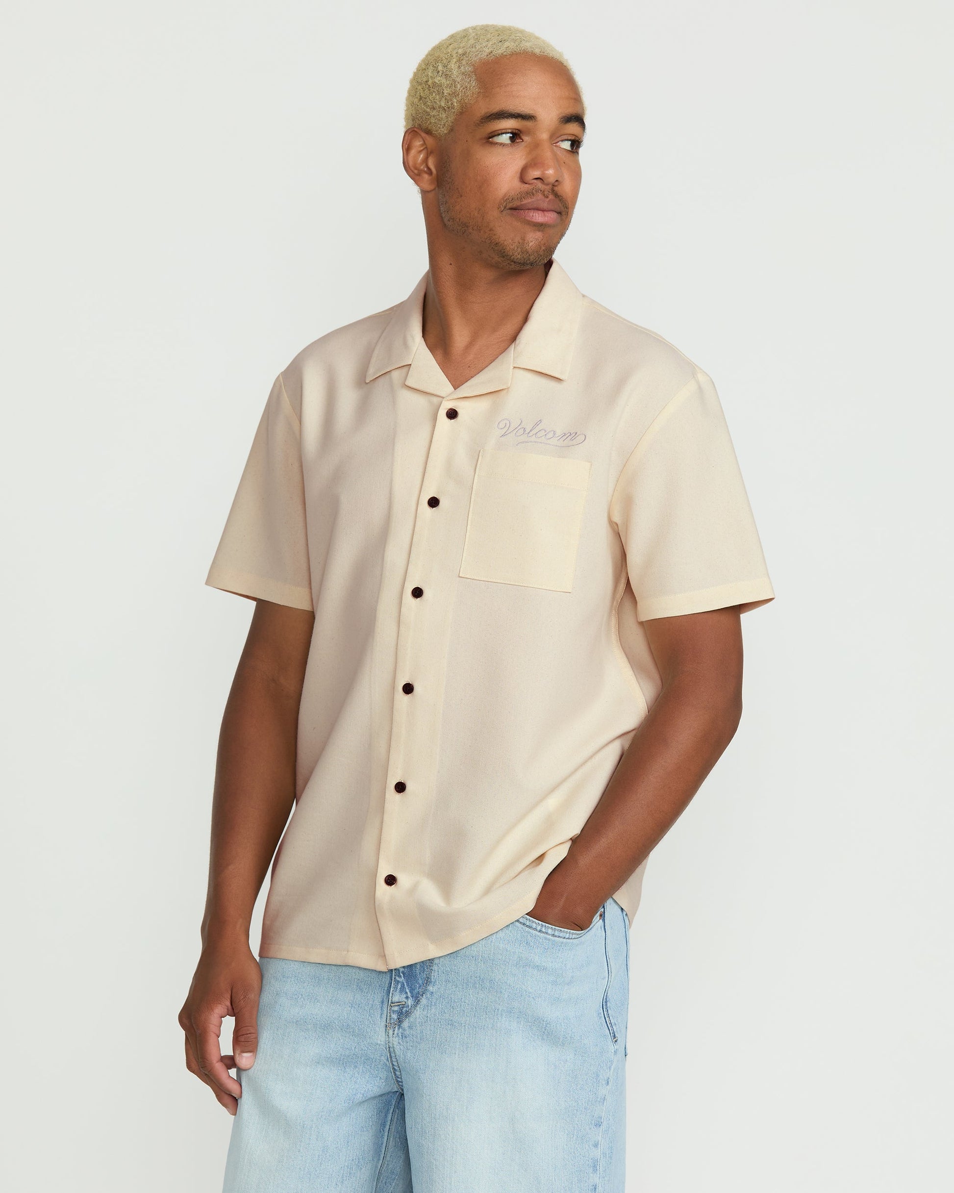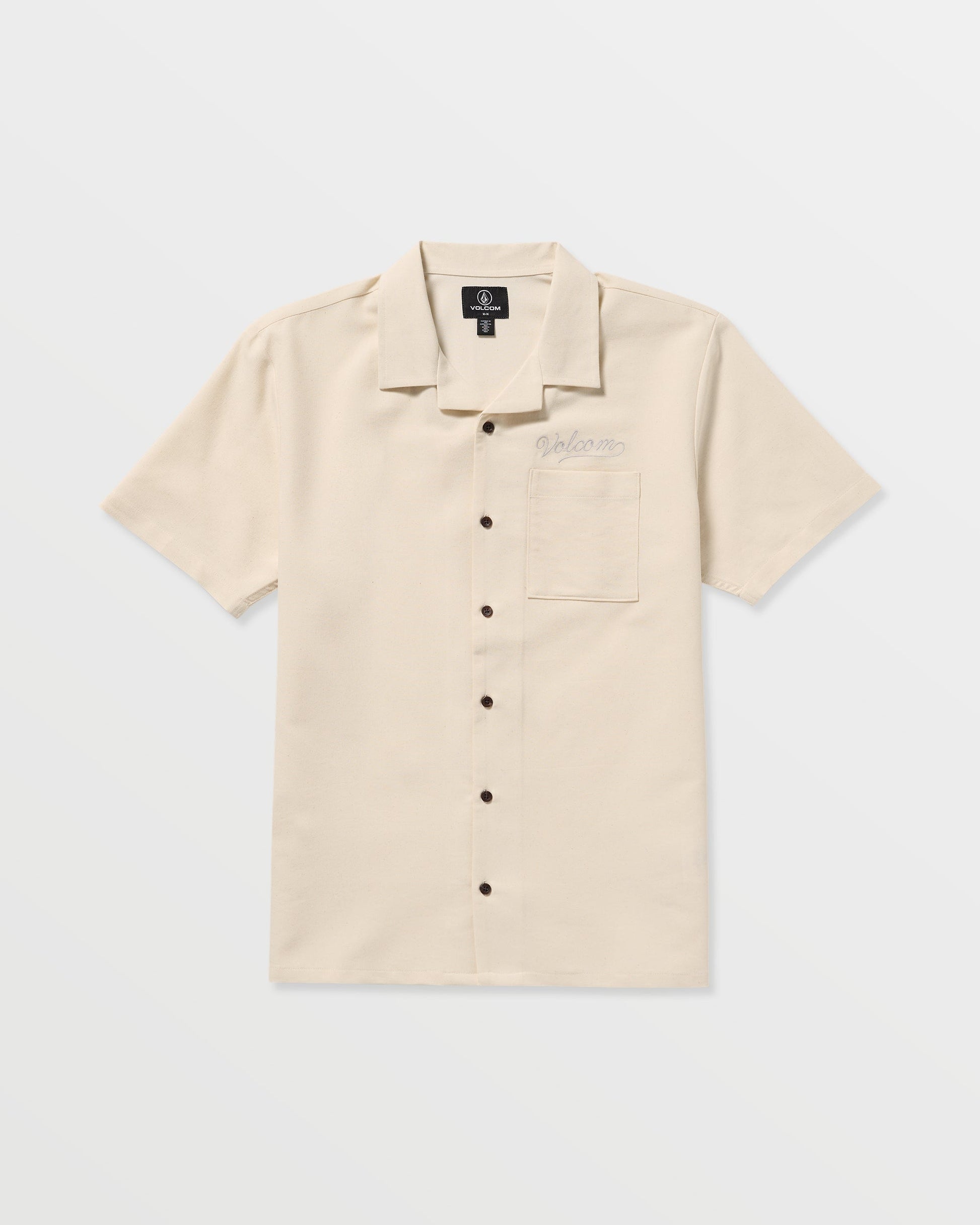 Relaxed boxy cotton-polyester shirt with custom branded buttons, patch chest pocket, and premium woven label with chain stitch embroidery detailing.